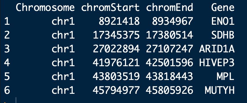 #?這個數(shù)據(jù)集是染色體片段突變頻率的數(shù)據(jù),數(shù)據(jù)內(nèi)容如上圖,第一列?染色體編號;第二列?染色體片段起始位點;第三列?染色體片段結(jié)束位點;第四列?染色體片段突變頻率