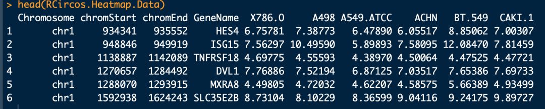 #?這個數(shù)據(jù)集中是6個不同樣本的基因表達量數(shù)據(jù),數(shù)據(jù)內(nèi)容如上圖,第一列?染色體編號,需要與第一步導(dǎo)入的染色體數(shù)據(jù)一致;第二列?基因在染色體片段起始位點;第三列?基因在染色體片段結(jié)束位點;第四列?基因名;第五列及以后?基因在不同樣本中的表達量