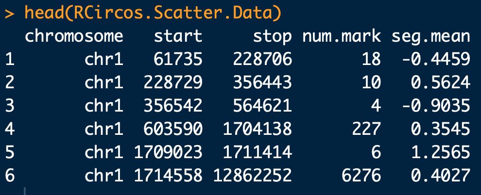 #?這個數(shù)據(jù)集是拷貝數(shù)變異的數(shù)據(jù),數(shù)據(jù)內(nèi)容如上圖,第一列?染色體編號,需要與第一步導(dǎo)入的染色體數(shù)據(jù)一致;第二列?突變位點在染色體片段起始位點;第三列?突變位點在染色體片段結(jié)束位點;第四列?突變位點拷貝數(shù);第五列?突變平均置信度