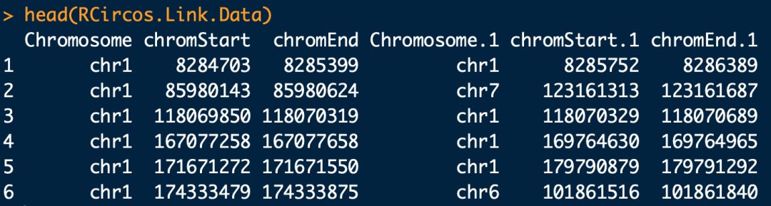 #?數(shù)據(jù)內(nèi)容如上圖,第一列?染色體編號;第二列?聯(lián)系位點在染色體片段的起始位點;第三列?聯(lián)系位點在染色體片段的結(jié)束位點;第四列?聯(lián)系位點在所在的另一個染色體編號;第五列?聯(lián)系位點在所在的另一個染色體片段的起始位點;第六列?聯(lián)系位點在所在的另一個染色體片段的結(jié)束位點
