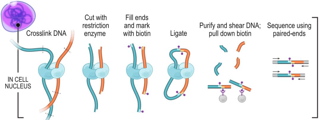 Hi-C:提供了一個(gè)真正全基因組范圍的相互作用圖譜(該圖譜的分辨率取決于測序的深度)——all?vs?all。