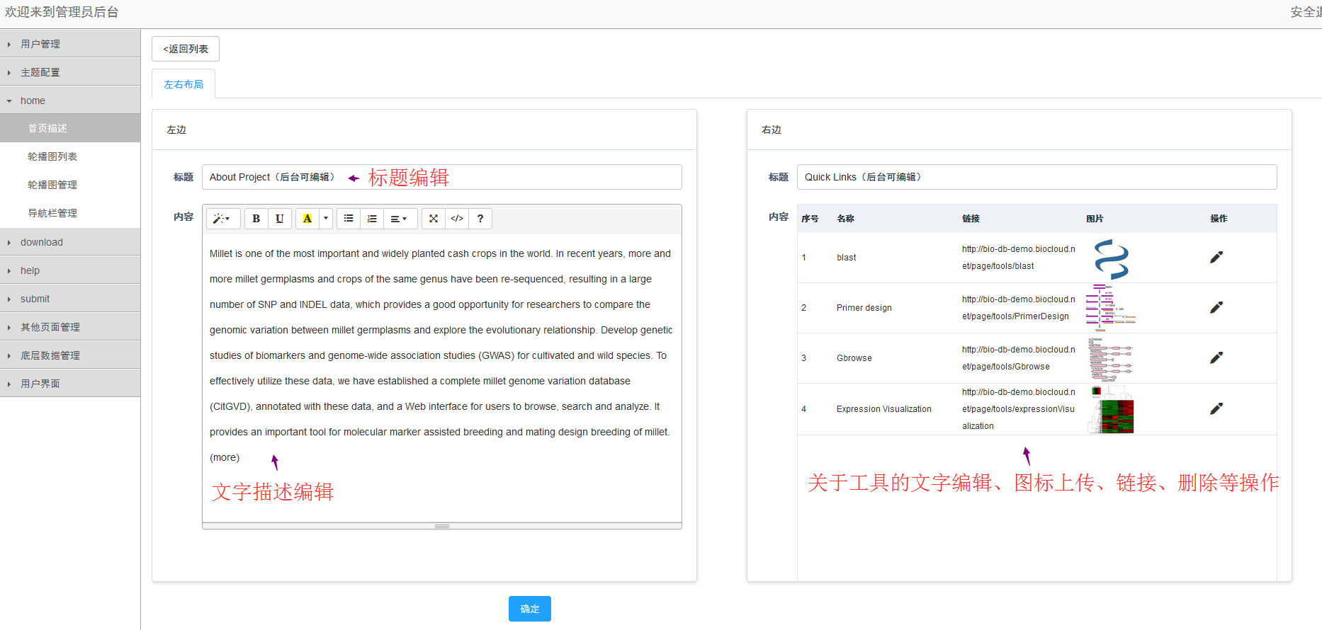 為了更好的服務(wù)于科研,物種數(shù)據(jù)庫推出了V2.0版:不但可共享研究成果,而且通過后臺(tái)管理系統(tǒng)可以完成logo、文字描述、配色、單位等信息的修改,更重要的是可以實(shí)現(xiàn)新增數(shù)據(jù)的一鍵式部署。