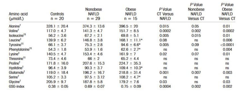 在NAFLD患者體中,經(jīng)常發(fā)現(xiàn)血漿中氨基酸的濃度增加,特別是支鏈氨基酸。然而,這一現(xiàn)象也可能是由于肌肉蛋白質(zhì)分解增加,肥胖和/或胰島素抵抗(IR)增加或是由于受損的組織代謝導(dǎo)致,其具體機制尚未可知。