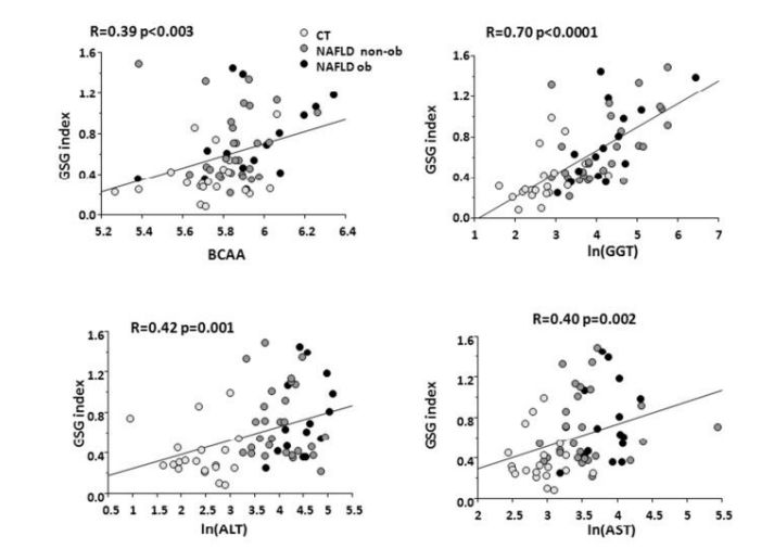 這些氨基酸以某種方式參與合成谷胱甘肽(GSH)和脂毒性相關(guān)的脂質(zhì)前體。 因此,我們測試了GSG指數(shù)與肝臟組織學(xué)改變的相關(guān)性,其中GSG-index指數(shù)計算了[Glutamate/(Serine+Glycine)]。