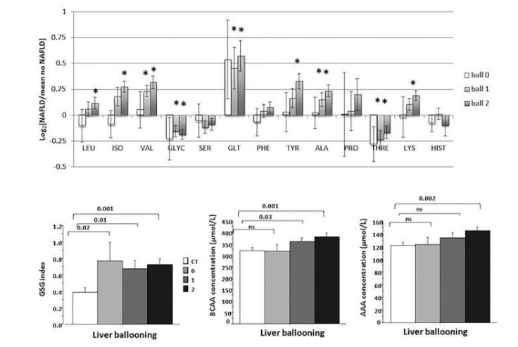 我們首先檢測肝臟炎癥和氣球樣變時哪些氨基酸的濃度改變。相比于對照組,氣球樣變2級的患者血漿中BCAA、AAA、谷氨酸,丙氨酸和賴氨酸含量增加,而甘氨酸和蘇氨酸濃度下降。 氨基酸濃度也與肝纖維化增加有關(guān),但在纖維化評分為3和4的NAFLD中觀察到的濃度與纖維化評分為0-2的患者沒有顯著差異。