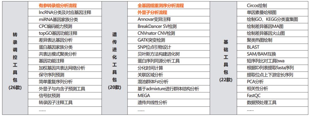 2)軟件:根據(jù)用戶需求我們提供了常用生信軟件,并封裝和串聯(lián)成常用分析模塊,通過單行命令即可完成很多常規(guī)分析內容,如基因表達量計算、突變檢測、基因功能注釋等。