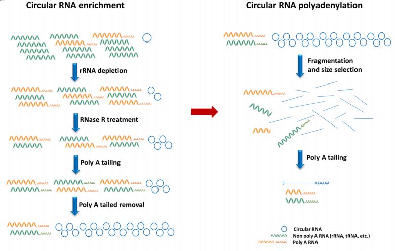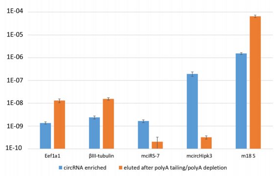 只有一小部分RNA是環(huán)狀的(例如,小鼠神經(jīng)系統(tǒng)中去rRNA的RNA庫(kù)中僅占約0.1%)。作者采用上述方法進(jìn)行circRNA-ONT測(cè)序,由于有些線性RNA分子對(duì)RNase R具有抗性,故而此方法比普通的去線性circRNA建庫(kù)多了一步:將剩余的線性RNA多聚腺苷酸化(poly A tailing)并使用poly(A)純化磁珠去除帶polyA尾的RNA分子。結(jié)果表明,該步驟使circRNA強(qiáng)烈富集。
