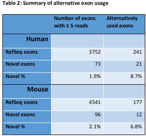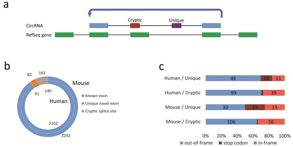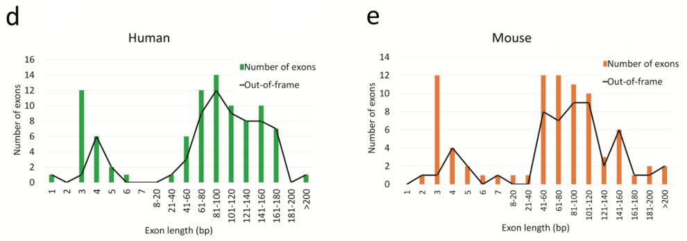 將circRNA根據(jù)新外顯子使用分類為“隱蔽的circRNA外顯子”(與注釋的外顯子共享5’或3’剪接位點(diǎn))或“獨(dú)特的circRNA外顯子”(全新的外顯子)。人類2,393個(gè)外顯子中的91個(gè)和小鼠中2,487個(gè)外顯子中的82個(gè)是獨(dú)特的circRNA外顯子,140和163個(gè)分別是隱蔽的circRNA外顯子。(所有單外顯子circRNA都被排除在該分析之外,因?yàn)樵趩蝹€(gè)read中需要完全覆蓋檢測(cè)到的外顯子,這對(duì)于單個(gè)外顯子circRNA而言在技術(shù)上是不可能的。)作者發(fā)現(xiàn)大多數(shù)獨(dú)特的circRNA外顯子在40-200bp范圍內(nèi),但也經(jīng)常觀察到3-6bp的非常短的外顯子(微外顯子)組。有趣的是,大多數(shù)circRNA特異性外顯子導(dǎo)致移碼突變或終止密碼子獲得,可能解釋了它們?cè)诰€性mRNA翻譯中缺失,因此受到無(wú)義介導(dǎo)降解。