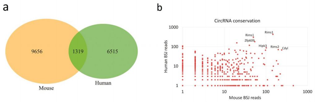 人和小鼠circRNA文庫(kù)的納米孔測(cè)序分別產(chǎn)生0.67M和1.06M reads,其中3.2%和3.3%跨越circRNA BSJ(Back splice junction)位點(diǎn)。人和小鼠中分別鑒定到7,834和10,975個(gè)circRNA,其中1,319個(gè)在人和鼠中保守的circRNA。在最高表達(dá)和保守的circRNA中,發(fā)現(xiàn)眾所周知的腦circRNA,例如circRims1、circRims2、circHipk3、circCdyl和circZfp609。整個(gè)數(shù)據(jù)集中,分別來(lái)自人和小鼠的2,945和7,052個(gè)circRNA先前未在circBase中注釋。
