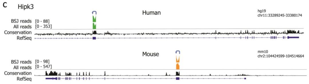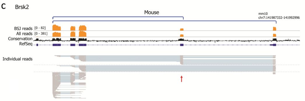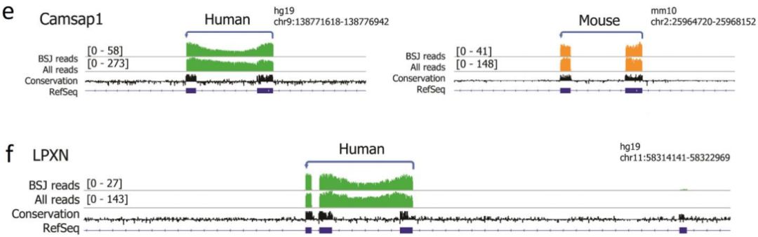 將所有小鼠和人跨越BSJ reads與各自的參考基因組比對(duì),并定量比對(duì)到外顯子或內(nèi)含子區(qū)域的堿基對(duì)的數(shù)量。為了將分析集中于更豐富的circRNA中的內(nèi)含子保留和其他可變剪接事件,僅進(jìn)一步研究了具有10個(gè)或更多BSJ reads并具有高于3%的平均內(nèi)含子百分比的circRNA。作者發(fā)現(xiàn)3個(gè)人和4個(gè)小鼠circRNA具有內(nèi)含子保留,而39和57個(gè)circRNA包含分別在人和小鼠的RefSeq中未注釋的外顯子序列。CAMSAP1 是circRNA內(nèi)含子保留實(shí)例,其僅發(fā)生在人RNA中;LPXN circRNA是僅在人中表達(dá)的circRNA。