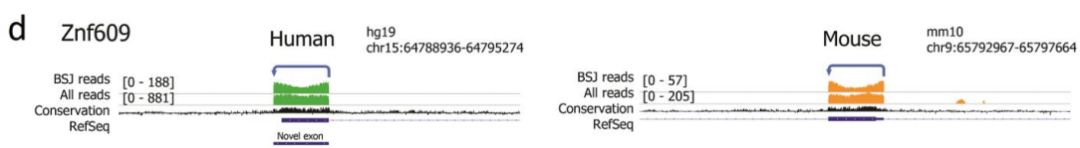 兩個(gè)高豐度circRNA:Hipk3和Zfp609(具有可變3’剪接位點(diǎn)的新型外顯子)的外顯子分布圖分別顯示在下圖: