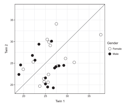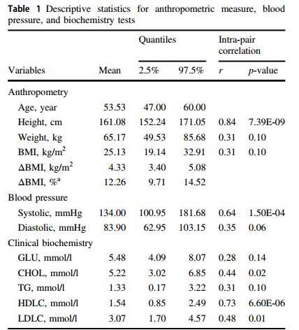 表1展示了樣本相關(guān)人體測(cè)量和生化變量的結(jié)果。最后一列是每個(gè)變量的對(duì)內(nèi)相關(guān)性。大多數(shù)變量具有相當(dāng)高的和/或顯著相關(guān)性,一些顯示低或不顯著的對(duì)內(nèi)相關(guān)性(例如GLU,TG)。下圖顯示了每對(duì)雙胞胎的BMI測(cè)量值。所有雙胞胎都與對(duì)角線保持距離,表明BMI測(cè)量中的對(duì)內(nèi)不一致。同時(shí),圖中的總體模式還表明如表1中報(bào)告的BMI的弱配對(duì)內(nèi)相關(guān)性(r = 0.307,p = 0.099)。在男性(實(shí)點(diǎn))和女性(空點(diǎn))雙胞胎中沒有觀察到BMI不一致的性別特異性模式。