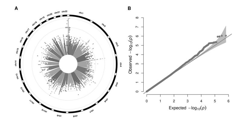 基于單個(gè)位點(diǎn)的EWAS分析,鑒定出136個(gè)CpG(p <1e-04),其中30個(gè)CpG(p <1e-05),2個(gè)CpG(p <1e-06)。 沒有位點(diǎn)達(dá)到全基因組顯著性(定義為FDR <0.05),最低FDR = 0.195。 圖中顯示了每個(gè)CpG位點(diǎn)的p值與其染色體位置的曼哈頓圖(圖a)和針對(duì)隨機(jī)預(yù)期p值分布繪制的預(yù)估p值的Q-Q圖(圖b)。最顯著CpG?p值表明與隨機(jī)分布的偏差及其陰影區(qū)域的95%置信區(qū)間(圖b),說明這些CpG與BMI的非隨機(jī)關(guān)聯(lián)。