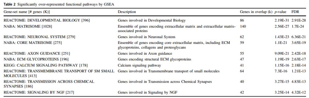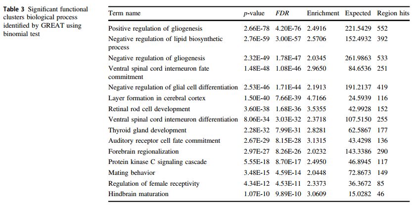 采用biomaRt,38487個(gè)CpG中(P<0.05),23,863個(gè)CpG注釋到2542個(gè)功能基因,基于GSEA在BioCarta 基因集, KEGG 基因集和Reactome基因集富集分析。富集通路相關(guān)基因包括參與編碼細(xì)胞外基質(zhì)(ECM)相關(guān)蛋白,包括ECM糖蛋白、膠原蛋白和蛋白多糖;以及參與神經(jīng)元系統(tǒng)和發(fā)育生物學(xué)的基因。富集結(jié)果也涉及神經(jīng)元功能通路,涉及參與化學(xué)突觸傳遞,軸突導(dǎo)向和NGF信號(hào)傳導(dǎo)(神經(jīng)生長因子)的基因。38,487(p < 0.05)個(gè)CpGs采用GREAT分析其富集的調(diào)控區(qū)域。結(jié)果表明15個(gè)具有統(tǒng)計(jì)學(xué)意義(p < 1.072e-10)的生物學(xué)功能聚類,涉及膠質(zhì)細(xì)胞再生正負(fù)調(diào)節(jié)(FE:2.49, FE:2.03)、脂質(zhì)合成負(fù)調(diào)節(jié)( FE:2.61)、甲狀腺發(fā)育 (FE:2.83)、視網(wǎng)膜桿細(xì)胞發(fā)育(FE: 3.54)等。