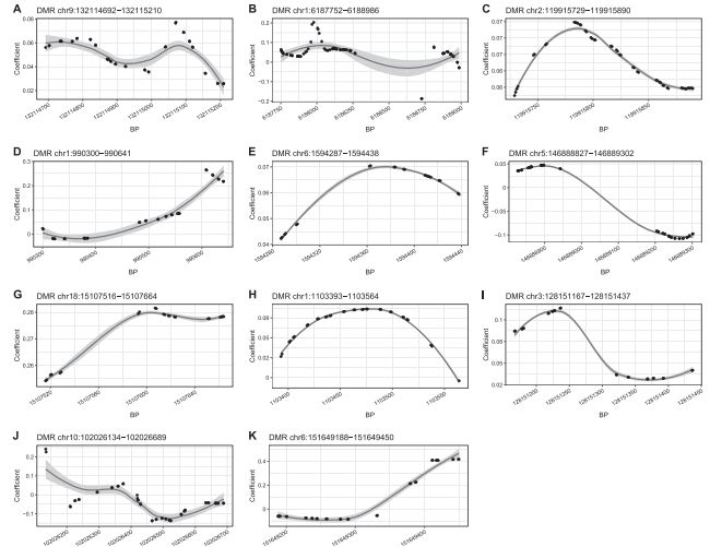 采用comb-p矯正p,鑒定出11個(gè)FDR<0.1的DMR,其中9個(gè)FDR<0.05,位于染色體1、2、3、5、6、9、10和18 。4個(gè)有意義的 DMRs (從chr 1:1103393-1103564,chr 1:990300-990641;chr 6:1594287-1594438;?chr 10:102026134-102026689 )包含了有顯著意義的CpGs 。4個(gè)DMR位于基因間區(qū),其余7個(gè)注釋在9號(hào)染色體LINC01503(RNA基因)、5號(hào)染色體DPYSL3(與非酒精性脂肪肝相關(guān)), 1號(hào)染色體CHD5和AGRN(有研究孕婦體重指數(shù)對(duì)新生兒血液DNA甲基化的影響), 2號(hào)染色體C1QL2, 10號(hào)染色體CWF19L1, 及6號(hào)染色體 AKAP12。圖中展示了11個(gè)DMR的甲基化模式,除了圖f和j的DMR與BMI呈負(fù)相關(guān)外,其余9個(gè)DMR與BMI呈正相關(guān)。采用Danish雙胞胎的基因表達(dá)數(shù)據(jù),檢驗(yàn)了與11個(gè)DMR相關(guān)的7個(gè)基因表達(dá)水平與BMI的相關(guān)性。LINC01503和AKAP12有顯著意義。