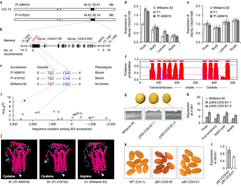 隨后對(duì)RIL的兩個(gè)子集進(jìn)行處理,以通過(guò)測(cè)序(GBS)進(jìn)行基因分型。基因型和表型數(shù)據(jù)的組合在PI 468916和PI 479752中在13號(hào)染色體上種皮開(kāi)花的基礎(chǔ)上定義了一個(gè)區(qū)域(圖2a),該區(qū)域與先前映射的B1區(qū)域重疊,表明這兩個(gè)種質(zhì)由B1基因座控制。在映射區(qū)域內(nèi)的其他標(biāo)記用于鑒定兩個(gè)RIL群體中與B1基因座之間的重組體,最后根據(jù)大豆參考基因組序列將B1基因座精細(xì)映射到一個(gè)包含兩個(gè)基因(Glyma.13G241700、Glyma.13G241800)的14.5 kb區(qū)域(圖2b)。對(duì)三個(gè)親本系的兩個(gè)基因進(jìn)行測(cè)序,Williams 82和兩個(gè)大豆親本之間的差異只有一個(gè)SNP位點(diǎn),即Glyma13G241700的編碼序列(CDS)中的一個(gè)(C到T)點(diǎn)突變,導(dǎo)致氨基酸從半胱氨酸變?yōu)榫彼幔▓D2c)?;ê?周,Glyma.13G241700在發(fā)育中的豆莢中最高表達(dá),其在PI 468916和(Williams 82×PI 468916)F1中的表達(dá)水平相似,但均明顯高于Williams 82(圖2d)。相比之下,兩個(gè)親本中的Glyma.13G241800和F1的表達(dá)水平?jīng)]有顯著差異(圖2e)。這些觀察結(jié)果表明,雙親中的Glyma.13G241700最有可能成為B1的候選基因,預(yù)計(jì)B1編碼跨膜轉(zhuǎn)運(yùn)蛋白樣蛋白(圖2f)。