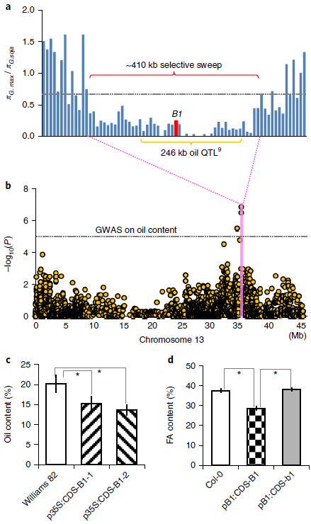 先前通過(guò)全基因組關(guān)聯(lián)研究(GWAS)使用302個(gè)重測(cè)序種質(zhì)的子集,確定了潛在的主要QTL種子油含量,包括46 個(gè)G. soja種質(zhì)和127個(gè) G. max種質(zhì)的種子油含量信息(www.ars-grin.gov/npgs)和一個(gè)246 kb 的QTL區(qū)域在35,194,140 bp處達(dá)到峰值,位于B1基因座的下游約31 kb處(圖3a)與籽油含量的變化顯著相關(guān)。由于G. soja和G. max的種子油含量差異很大,前者的平均值約為10.9%,后者的平均值約為18.0%,因此認(rèn)為該油脂QTL為可能是造成栽培大豆種子油含量升高的原因。