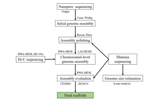 占比地球容量71%的海洋中蘊藏著豐富的生物資源,而海洋生物體內(nèi)多糖和蛋白含量較高,以及部分海洋生物極易死亡腐敗從而引起DNA的降解,給高純度、完整的基因組DNA的獲取帶來了極大的困難。而海洋生物通常與陸生動植物相比更為復雜,組裝拼接的難度更大。本次研究使用Nanopore測序技術突破了這些瓶頸,完成了海洋魚類超高質(zhì)量的基因組組裝!研究中使用104X Nanopore測序數(shù)據(jù)進行基因組組裝,通過Canu、WTDBG等多款軟件分別進行組裝,選取組裝結果(主要從基因組大小,contig N50,組裝完整性,組裝準確性等方面評估)進行后續(xù)研究優(yōu)化。研究者最終使用WTDBG軟件組的基因組版本結合Hi-C技術的進一步優(yōu)化,組裝完成474.31 Mb基因組,并將99.44%的基因組掛載至20條染色體上,?ContigN50提升至22.46 Mb,且最長的Contig達到32.32 Mb!