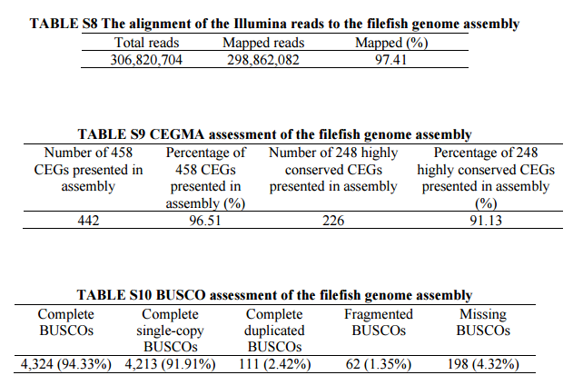 眾所周知,Contig N50是衡量基因組組裝質(zhì)量好壞的一個重要指標,一定程度上來說,ContigN50值越高表示組裝的質(zhì)量越好。與已有鲀形目基因組比較,綠鰭馬面鲀基因組組裝的ContigN50超過了同樣使用三代測序進行組裝的黃鰭東方鲀(Takifugu flavidus)的5倍,更是超過了翻車魚(Mola mola)的1000倍!