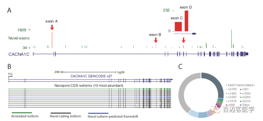 在CACNA1C基因座內(nèi)總共注釋了39個潛在的新外顯子,其中38個在至少2個人或組織中被識別,并在每個文庫中得到至少5條nanopore reads的支持(圖2A)。通過PCR和Sanger測序確認(rèn)了新的外顯子與其周圍的注釋外顯子之間的剪接連接,從而驗(yàn)證了四個新的外顯子。這種新的外顯子的成功驗(yàn)證提供了很高的可信度,即通過納米孔測序鑒定的新的外顯子是真實(shí)的,并且被整合到CACNA1C轉(zhuǎn)錄本中。表達(dá)量最高的10條轉(zhuǎn)錄本中,有9條是新的且其中有8條被預(yù)測保持CACNA1C閱讀框架,這表明這些最豐富的新轉(zhuǎn)錄本中有一些編碼功能不同的蛋白質(zhì)異構(gòu)體(圖2B,C)。這些結(jié)果表明,新的CACNA1C轉(zhuǎn)錄本表達(dá)豐富,數(shù)量也很多,目前的注釋缺少許多最豐富的CACNA1C轉(zhuǎn)錄本。