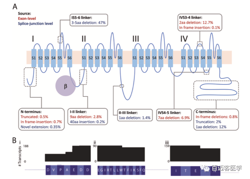 CACNA1C編碼CaV1.2 的主要成孔亞基。鈣孔由24個跨膜重復(fù)序列組成,由細(xì)胞內(nèi)環(huán)連接成4個結(jié)構(gòu)域(I-IV)(圖4A)。在我們鑒定的83個新的外顯子水平的轉(zhuǎn)錄本中,51個可能編碼功能性的CaV1.2通道。灰色方框表示新的、框架內(nèi)的插入和刪除的位置(值表示包含每個isoforms的reads的平均比例)。使用兩種分析方法(外顯子水平和剪切連接水平)鑒定變體的情況,外顯子水平計(jì)數(shù)用于得出豐度(紅色文本);僅使用剪接位點(diǎn)水平方法鑒定的變體用藍(lán)色文本表示。包含三個微缺失的蛋白質(zhì)異構(gòu)體的數(shù)量:(I)在I-II接頭中,(Ii)在IV4-5接頭中,以及(Iii)在IV3-4接頭中先前報道的微缺失(圖4B)。