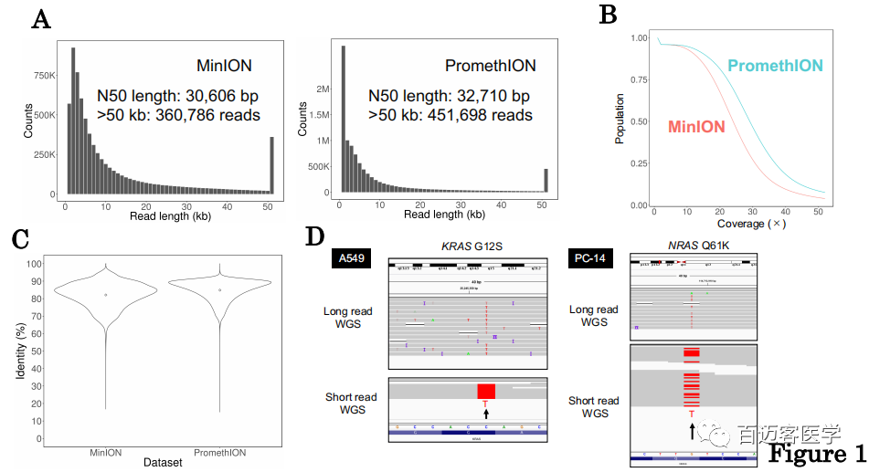 PromethION vs MinION:為了探究PromethION測序是否與MinION測序兼容,比較了獲得的兩個數(shù)據(jù)集的特征。Reads長度的總體分布是相似的(圖1A)。這兩個數(shù)據(jù)集都包含很大一部分超過50 kb的長讀長reads(MinION:360,786個讀,PromethION:451,698個),20X以上測序深度覆蓋了超過50%的人類基因組區(qū)域(圖1B),兩個數(shù)據(jù)集均顯示了超過80%的整體保真度(圖1C),與先前的研究相似。PromethION平臺各項指標(biāo)稍微好一點。結(jié)論:PromethION是用于整個癌癥基因組測序的有效分析方法。