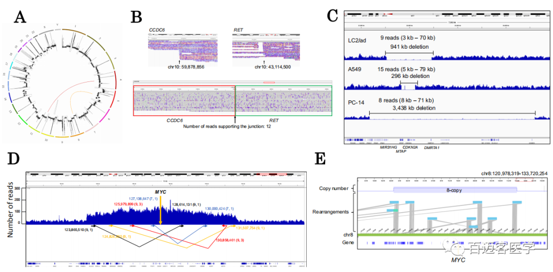 使用長讀長測序數(shù)據(jù),嘗試檢測比點突變大的結(jié)構(gòu)畸變(圖2A)。從LC2/ad的MinION/PromethION數(shù)據(jù)集中,成功鑒定出12條reads與CCDC6-RET融合基因的junction位點直接重疊,這是該細(xì)胞系已知的“癌癥驅(qū)動突變”(圖2B)。進(jìn)一步嘗試鑒定大的缺失,前人報道抑癌基因CDKN2A基因周圍有大的缺失,發(fā)生在LC2/ad,A549和PC-14細(xì)胞中。使用這項研究中的MinION/PromethION數(shù)據(jù)集,我們再次確認(rèn)了該基因在各細(xì)胞中的缺失(圖2C)。此外,每個CDKN2A缺失的√確連接點在細(xì)胞類型之間是不同的。