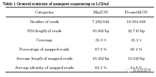 使用納米孔測序儀MinION及其更高通量PromethION平臺進(jìn)行了長讀長全基因組測序分析。首先通過對LC2/ad的基因組進(jìn)行測序來驗證新型PromethION儀器的性能,LC2/ad是源自日本肺腺癌患者的肺癌細(xì)胞系。作為參考,作者從總共33個MinION runs(R9.5)中收集了全基因組測序數(shù)據(jù),以31×的總測序深度覆蓋了整個人類基因組,共有7,282,846條reads(93,813,338,154 base)。reads的*大長度和N50長度分別為2,495,160 bp和30,606 bp。采用Minimap2將67.5%的reads比對到人類參考基因組UCSC hg38。比對上的reads平均長度為16,452 bp,總體序列一致性平均為82%,比以前的長讀長人類癌癥基因組測序分析顯著增長。PromethION測序需要大約三個flowcells才能產(chǎn)生總共10,064,668個reads(100,440,433,160 bp),總覆蓋率為33x,Reads的*大長度和N50長度分別為987,834 bp和32,710 bp。使用Minimap2,將69.4%的讀數(shù)定位到參考基因組。比對上的reads平均長度為13,620 bp,平均一致性為84.8%。值得注意的是,對于31X 93G數(shù)據(jù)量,PromethION平臺不需要制備多個文庫33次測序,因此與MinION相比,PromethION所需的起始DNA總量可減少十倍以上。
