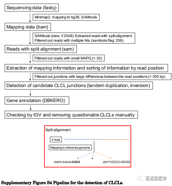 為了更普遍地識別所有肺癌細(xì)胞系其他基因座中的CLCL,作者構(gòu)建了一條新的分析性生物信息學(xué)流程。簡而言之,利用了來自比對結(jié)果的split比對信息,根據(jù)reads位置對比對信息進(jìn)行排序,并提取了候選CLCL。相關(guān)的reads被重組以重建其結(jié)構(gòu)。