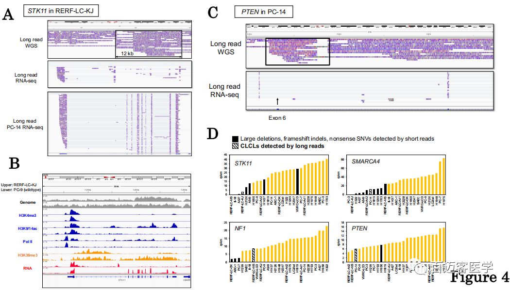 在其他細(xì)胞系中也成功鑒定出以下數(shù)量的CLCL:LC2/ad中有16個,A549中有1個,RERF-LC-KJ中有7個,RELF-LC-MS中有7個,PC-14中有11個。重要的是,CLCLs甚至出現(xiàn)在關(guān)鍵的癌癥基因中,例如STK11,NF1,SMARCA4和PTEN基因。異常的結(jié)構(gòu)各不相同,并且由于其復(fù)雜的結(jié)構(gòu)和受累區(qū)域的大小,傳統(tǒng)的基于短讀長測序分析的方法不易檢測到它們中的大多數(shù)。相對簡單的一種是在RERF-LC-MS細(xì)胞的NF1基因中檢測到的(圖3B),內(nèi)含子9(chr17:31,200,948)和最后一個外顯子36的下游區(qū)域(chr17:31,278,880;在交界處有6條reads支持)之間的串聯(lián)串聯(lián)重復(fù)。在另一種情況下,SMARCA4 CLCL的結(jié)構(gòu)顯示出從內(nèi)含子1(chr19:10,973,314)到內(nèi)含子20(chr19:11,022,573;在交界處有8條reads支持;圖3C)。在PC-14中的PTEN結(jié)構(gòu)中發(fā)現(xiàn)了更復(fù)雜的情況,該CLCL是倒位和缺失的組合(圖3D)。在這些相對簡單的情況下,將Illumina短reads重新映射到已發(fā)現(xiàn)的junction位點可驗證重建結(jié)構(gòu)的√確識別。