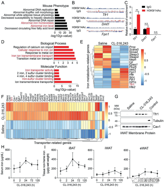本研究首先利用Chip-seq (Fig 1A/B)、RNA-seq(Fig 1D/E)、蛋白組三種技術(shù)手段,從轉(zhuǎn)錄調(diào)控、mRNA、蛋白質(zhì)三個不同層面發(fā)現(xiàn)在實(shí)驗(yàn)組(C57BL/6J mice)中與鐵轉(zhuǎn)運(yùn)相關(guān)的啟動子 、基因、蛋白均有明顯的富集。為了驗(yàn)證結(jié)果的準(zhǔn)確性,對與鐵轉(zhuǎn)運(yùn)相關(guān)的啟動子進(jìn)行用Chip-qPCR(Fig 1C)的方法驗(yàn)證,對鐵轉(zhuǎn)運(yùn)相關(guān)的蛋白做了WB驗(yàn)證(Fig 1G),結(jié)果都顯示Tfr1基因在實(shí)驗(yàn)組(C57BL/6J mice)中的表達(dá)量明顯增加。綜上所述,Tfr1基因在CL-316,243處理的小鼠中Tfr1基因?qū)﹁F穩(wěn)態(tài)起著至關(guān)重要的作用。