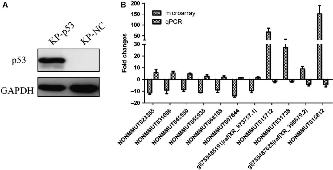 p53是臨床肺癌中最常見的突變抑癌基因,在我們的肺腺癌小鼠模型和KP細(xì)胞中均被誘導(dǎo)完全敲除。因此,作者探索了所選擇的210個(gè)保守的lncRNAs的非調(diào)控表達(dá)是否與p53的缺失有關(guān)。攜帶p53基因的慢病毒顆??稍贙P細(xì)胞中重新表達(dá)p53。如下圖A所示,p53在穩(wěn)定感染的KP細(xì)胞中有效地重新表達(dá)。qPCR結(jié)果顯示,p53再表達(dá)顯著改變了11個(gè)lncRNAs的表達(dá)(FC≥1.5),且差異倍數(shù)與上述p53缺失的肺腺癌組織芯片數(shù)據(jù)相反(圖B),表明p53的再表達(dá)對LncRNAs的表達(dá)有顯著影響。