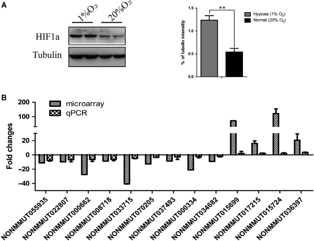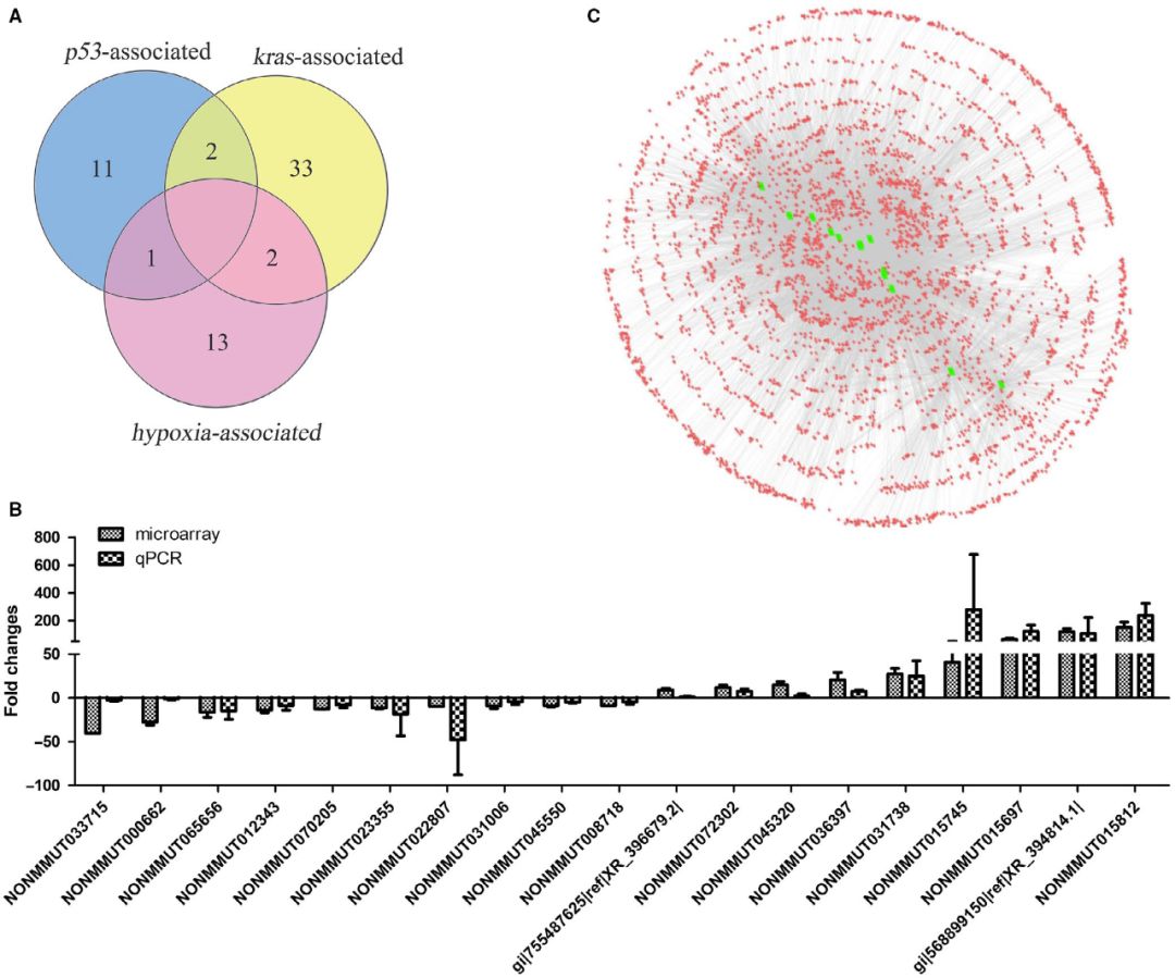 缺氧是實(shí)體腫瘤的一個(gè)顯著特征,低氧腫瘤通常對傳統(tǒng)的癌癥治療有抵抗力,且腫瘤低氧與晚期惡性腫瘤和轉(zhuǎn)移相關(guān)。作者進(jìn)一步研究了低氧調(diào)節(jié)的潛在的lncRNAs。將KP細(xì)胞在常氧(20% O2)和缺氧(1% O2)中培養(yǎng)48h,WB結(jié)果顯示缺氧可有效上調(diào)KP細(xì)胞HIF1α的表達(dá)(圖A)。RT-PCR結(jié)果顯示,缺氧誘導(dǎo)的KP細(xì)胞中有13個(gè)lncRNAs表達(dá)下調(diào),4個(gè)lncRNAs在缺氧誘導(dǎo)下表達(dá)上調(diào),其表達(dá)變化方向與小鼠肺腺癌組織芯片中的表達(dá)變化方向一致(圖B)。