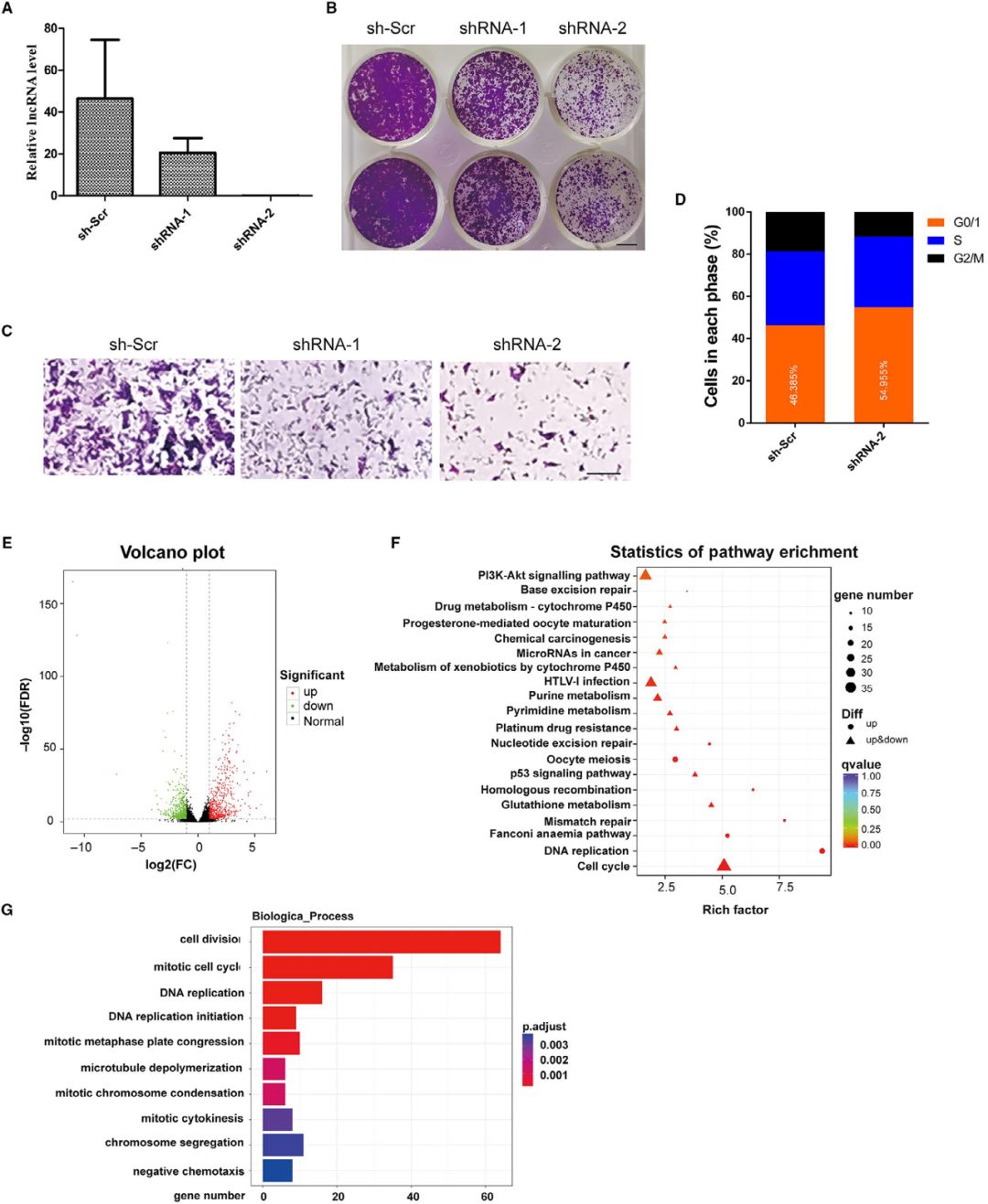 通過設(shè)計(jì)慢病毒介導(dǎo)的shRNAs來下調(diào)NONMMUT015812的表達(dá),qPCR結(jié)果顯示其可使KP細(xì)胞中NONMMUT015812的表達(dá)減少80%以上(圖A)。克隆形成實(shí)驗(yàn)顯示,NONMMUT015812基因的敲除顯著抑制了KP細(xì)胞的生長(圖B)。此外,在Transwell實(shí)驗(yàn)中,穩(wěn)定的NONMMUT015812基因敲除的KP細(xì)胞與對照細(xì)胞相比遷移明顯減少(圖C)。流式細(xì)胞術(shù)分析表明,NONMMUT015812基因敲除導(dǎo)致KP細(xì)胞明顯阻滯于G0/G1期,G2/M期細(xì)胞數(shù)量減少(圖D)。而NONMMUT015812基因敲除對細(xì)胞凋亡無明顯影響。
