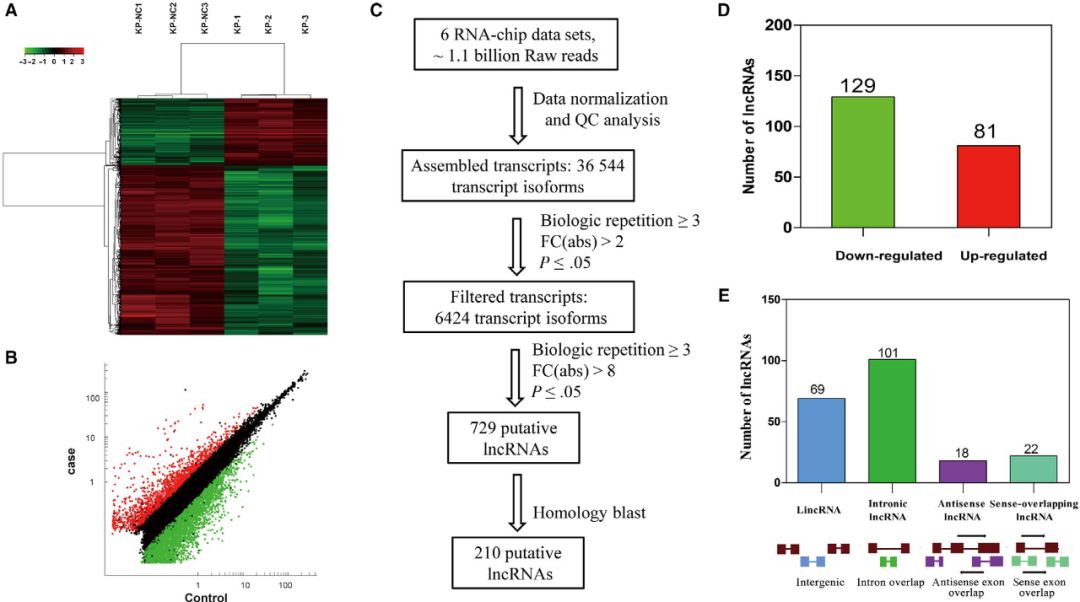 使用芯片技術(shù)檢測lncRNA,差異表達(dá)lncRNAs的散點(diǎn)圖和聚類圖顯示了肺腺癌和正常肺樣本之間有明顯區(qū)別(圖A、B)。重點(diǎn)研究了在人和鼠之間具有較高差異倍數(shù)且保守的lncRNAs,當(dāng)FC>8,P<0.05時(shí),鑒定到729個(gè)lncRNA。根據(jù)染色體位置保守性和序列保守性,篩選出210個(gè)具有潛在人類同源物的lncRNA用于后續(xù)驗(yàn)證,其中129個(gè)上調(diào),81個(gè)下調(diào)(圖C、D)。根據(jù)其基因組位置,將210個(gè)lncRNA分為u(基因間)、i(內(nèi)含子)、x(反義)和o(正義重疊)四大類。已鑒定的lncRNAs大部分屬于i類,有101個(gè)(48.09%)(圖E)。