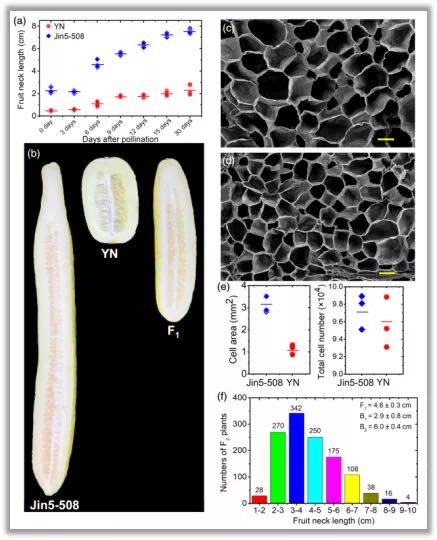 授粉30天后,雙親Jin5-508和YN黃瓜果把長度不再增長,于是選擇該時間節(jié)點作為果把長度鑒定的時期(圖1a)。Jin5-508果把長度顯著長于YN,這種差異是因為Jin5-508果把果肉細胞體積大于YN,而非細胞數(shù)增多(圖1b,c,d,e)。統(tǒng)計F1群體、回交群體和F2群體果把長度發(fā)現(xiàn),F(xiàn)1群體表現(xiàn)出中親表型,而回交群體表型更偏向于輪回親本,F(xiàn)2群體表現(xiàn)出連續(xù)的近正態(tài)分布(圖1f),以上結(jié)果表明黃瓜果把長度是數(shù)量性狀。