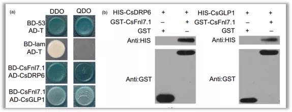 利用酵母雙雜技術(shù),以CsFnl7.1蛋白為誘餌篩選與其互做的蛋白,結(jié)果顯示共得到53個陽性克隆,在這些蛋白中有多個與細胞伸展相關(guān),包括CsDRP6和CsGLP1(圖8a)。體外pull down實驗顯示,融合蛋白HIS-CsDRP6和HIS-CsGLP1可以被GST-CsFnl7.1高效捕獲,而對照GST則不能(圖8b)。以上結(jié)果充分說明CsFnl7.1與CsDRP6、CsGLP1之間存在互做關(guān)系。