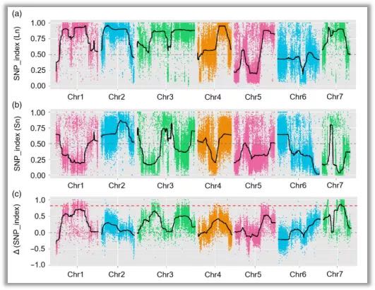 作者在1231個F2群體(Jin5-508 × YN)選擇了長把和短把單株各50個,構(gòu)建2個極端性狀DNA混池,對該混池及雙親進行高通量測序及BSA分析。親本測序深度分別為34x(Jin5-508)和20x(YN),混池測序深度分別為61x和52x。測序數(shù)據(jù)與黃瓜參考基因組9930比對,2個混池分別開發(fā)了342,496和399,764個SNP,基于SNP index算法,在chr7上定位到一個主效QTLFnl7.1?(閾值0.833),區(qū)間范圍9.98–14.61 Mb(圖2c)。