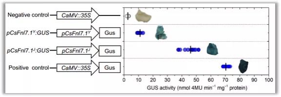 序列分析顯示,雙親CsFnl7.1啟動子區(qū)存在多處序列差異(25個SNPs和7個InDels),因此作者將雙親的啟動子進行了克隆,分別與GUS基因構(gòu)建整合質(zhì)粒,轉(zhuǎn)化煙草葉片進行啟動子活性分析。發(fā)現(xiàn)Jin5-508啟動子(pCsLEAJ)活性是YN啟動子(pCsLEAY)活性的4倍(圖6)。這與轉(zhuǎn)錄組分析結(jié)果一致(授粉當天CsFnl7.1在Jin5-508表達量顯著高于YN),從而說明CsFnl7.1表達受順式調(diào)控。