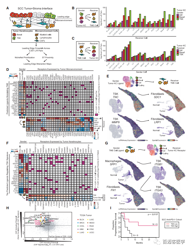 進(jìn)一步,我們整合scRNA-seq和ST數(shù)據(jù)來描述前沿鄰近腫瘤和TME細(xì)胞之間的信號(hào)通路(圖6A)。基于配體-受體對(duì)數(shù)據(jù)庫,TSKs廣參與了自分泌和旁分泌相互作用(主要與CAFs、內(nèi)皮細(xì)胞、巨噬細(xì)胞和MDSCs)(圖6B&C)。我們使用NicheNet和ST對(duì)前沿預(yù)測(cè)為調(diào)節(jié)TME特異性細(xì)胞類型標(biāo)記的腫瘤KC配體進(jìn)行優(yōu)先排序。與TSK-纖維血管生態(tài)位一致的是,對(duì)CAFs的顯著TSK信號(hào)通路是由幾對(duì)TSK-CAF配體-受體對(duì)介導(dǎo)的,包括MMP9-LRP1和TNC-SDC1(圖6D&E)。此外,TSKs可通過配體-受體對(duì)(PGF-FLT1、PGF-NRP2和EFNB1-EPHB4)調(diào)節(jié)內(nèi)皮細(xì)胞。相反地,內(nèi)皮細(xì)胞和CAFs顯著共表達(dá)NicheNet預(yù)測(cè)配體,如TFPI, FN1,和THBS1,這些與TSK受體匹配(圖6F&G)。進(jìn)一步證實(shí)TSKs是一種類似EMT的群體。為了判定TSK細(xì)胞是否與多變的TME普遍關(guān)聯(lián),我們調(diào)研了TCGA數(shù)據(jù)庫中31種實(shí)體瘤數(shù)千個(gè)轉(zhuǎn)錄組數(shù)據(jù)。我們進(jìn)一步判定TSK配體是否誘導(dǎo)CAF基因(1)伴隨配體CNV缺失,減少CAF基因表達(dá);(2)配體表達(dá)和CAF基因的關(guān)聯(lián)(圖6H),這個(gè)在過往研究中被證實(shí)。另外TSK細(xì)胞可以抑制抗腫瘤免疫。雖然這些研究還不明確TSK細(xì)胞是內(nèi)在抵抗還是免疫調(diào)節(jié)活性起作用,但這個(gè)亞群提供了一個(gè)提高免疫治療的目標(biāo)方向。