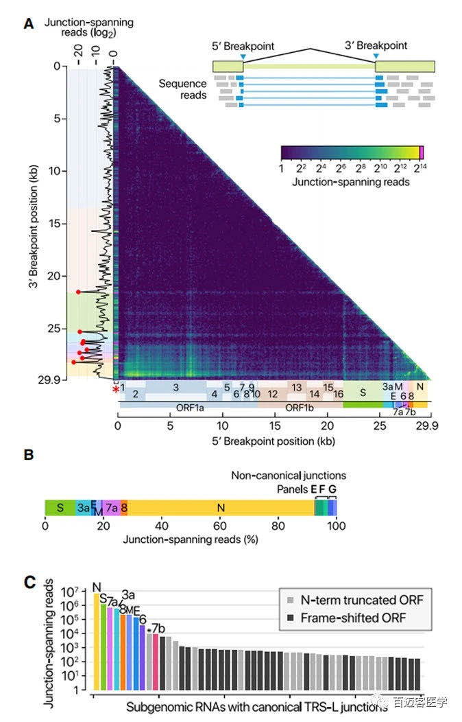 用DNB-seq確認(rèn)和檢查CoV基因組的junctions。在junctions處繪制了5’和3’斷點(diǎn),并通過計(jì)算跨越j(luò)unctions的reads來(lái)估算融合頻率(圖2A)。如所預(yù)期的,leader代表了最突出的5’ 位點(diǎn)(圖2A,x軸上的紅色星號(hào))。TRS-B被檢測(cè)為3’位點(diǎn)的頂端(圖2A,y軸上的紅點(diǎn))。這些結(jié)果證實(shí),SARS CoV-2使用標(biāo)準(zhǔn)的TRS介導(dǎo)的模板轉(zhuǎn)換機(jī)制進(jìn)行不連續(xù)轉(zhuǎn)錄,以產(chǎn)生主要的sgRNA(圖2B)??缭絡(luò)unctions reads的定量比較顯示,N RNA是表達(dá)最豐富的轉(zhuǎn)錄本,其次是S,7a,3a,8,M,E,6和7b(圖2C)。