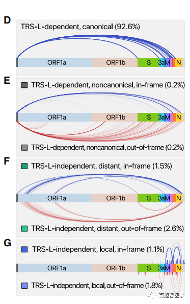 SARS-CoV-2除了具有預(yù)期結(jié)構(gòu)和長(zhǎng)度的經(jīng)典sgRNA(圖4D),結(jié)果還顯示出許多次要的junction sites(圖4E–4G)。這種融合事件有三種主要類型。第一組中的RNA在位于ORF或UTR中間非預(yù)期的3’位點(diǎn),前導(dǎo)序列(leader)與下游編碼序列(body)結(jié)合(圖4E,TRS-L-dependent noncanonical)。第二組顯示了與前導(dǎo)序列沒有相似性的序列之間的遠(yuǎn)距離融合(圖4F, TRS-L-independent distant)。最后一組局部融合,這導(dǎo)致較小的缺失,主要發(fā)生在結(jié)構(gòu)基因和輔助基因中,包括S ORF(圖4G,TRS-L-independent local recombination)。