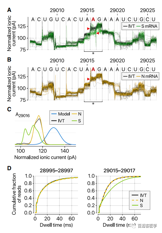 研究人員用DRS數(shù)據(jù)檢測(cè)了SARS-CoV-2的表觀轉(zhuǎn)錄組學(xué)。病毒RNA修飾在40多年前就已描述過(Gokhale and Horner,2017)。為了明確研究RNA修飾,作者通過體外轉(zhuǎn)錄病毒序列生成了陰性對(duì)照RNA,并對(duì)陰性對(duì)照進(jìn)行了直接RNA測(cè)序。注意到陰性對(duì)照和病毒轉(zhuǎn)錄本之間的離子電流之間的差異非常有趣(圖6A)。至少有41個(gè)位點(diǎn)顯示出實(shí)質(zhì)性差異(頻率超過20%),表明存在潛在的RNA修飾位點(diǎn)。值得注意的是,某些位點(diǎn)顯示的頻率取決于sgRNA的種類。圖6A–6C,S RNA上比N RNA修飾的位點(diǎn)更多,與S RNA相比ORF8 RNA上的修飾頻率更高。此外,修飾的堿基(圖6D,右)的停留時(shí)間比未修飾的堿基(圖6D,左)的停留時(shí)間長(zhǎng),表明修飾會(huì)干擾RNA分子過孔速度。