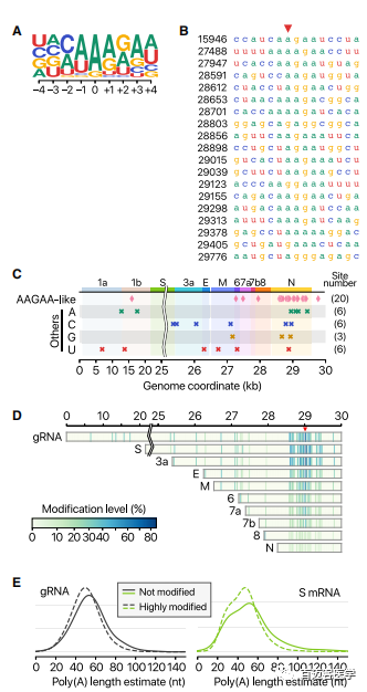 在41個(gè)潛在的修飾位點(diǎn)中,最常見的motif是AAGAA(圖7A和7B)。在整個(gè)病毒基因組中都發(fā)現(xiàn)了“AAGAA-like”motif的修飾位點(diǎn)(包括AAGAA和其他富含A/G的序列),尤其是在基因組28,500-29,500處特別豐富(圖7C)。病毒長(zhǎng)的轉(zhuǎn)錄本(gRNA,S,3a,E和M)比短RNA(6、7a,7b,8和N)的修飾頻率更高(圖7D),表明該修飾是特定于某些RNA種類。因?yàn)镈RS可以同時(shí)檢測(cè)單個(gè)分子上的多個(gè)特征,所以作者交叉檢測(cè)了poly(A)尾長(zhǎng)和內(nèi)部修飾位點(diǎn)。有趣的是,修飾的RNA分子的poly(A)尾比未修飾的短(圖7E)。這些結(jié)果表明內(nèi)部修飾和3’尾之間存在聯(lián)系。由于poly(A)尾巴在RNA周轉(zhuǎn)中起重要作用,因此很容易推測(cè)所觀察到的內(nèi)部修飾與病毒RNA穩(wěn)定性控制有關(guān)。