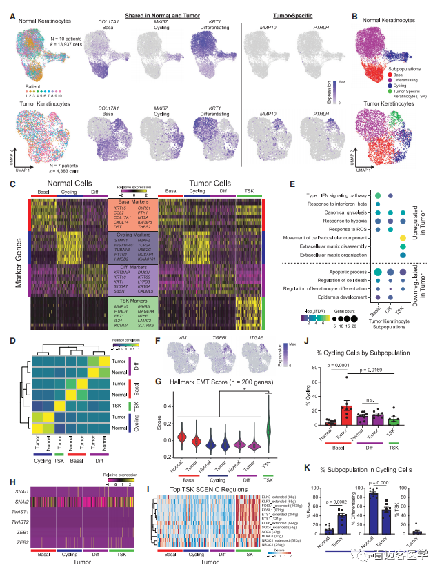 重新聚類正常上皮細胞后,在正常皮膚中觀察到3個主要的角質(zhì)細胞(KC)亞群(基底、循環(huán)、分化細胞)。典型相關(guān)分析表明腫瘤KCs廣泛重現(xiàn)了正常(基底、循環(huán)、分化細胞)亞群,在正常皮膚和cSCC中有幾個共享的標記基因(圖2A-D)。有趣的是,在腫瘤細胞聚類中出現(xiàn)了與正常皮膚無明顯關(guān)聯(lián)的第四個KC亞群,即TSK亞群(圖2B-D)。事實上,在這一簇與其他腫瘤細胞區(qū)別開來的100個基因中,有99個基因在腫瘤組織中的表達明顯高于正常組織。TSK標記基因與細胞運動和細胞外基質(zhì)分解有關(guān),暗示了它的侵入性(圖2E)。TSKs表達經(jīng)典的上皮-間質(zhì)轉(zhuǎn)化(EMT)標志物,如VIM和ITGA5(圖2F);但是EMT類似的TSK細胞缺乏經(jīng)典表達EMT轉(zhuǎn)錄因子(圖2H)。因此,我們通過單細胞調(diào)控網(wǎng)絡(luò)進行推理和聚類,提名AP1和ETS家族成員為潛在控制TSKs的TFs(圖2I)。TSK細胞也表現(xiàn)出較大的EMT評分范圍,提示細胞狀態(tài)具備高可塑性(圖2G),與EMT連續(xù)模型一致?;准毎˙asal)在腫瘤中的發(fā)生率約是正常循環(huán)細胞的四倍(圖2K)??偟膩碚f,cSCC表現(xiàn)出分化失常,基底細胞迅速增殖,并出現(xiàn)表達EMT連鎖基因的TSK亞群。