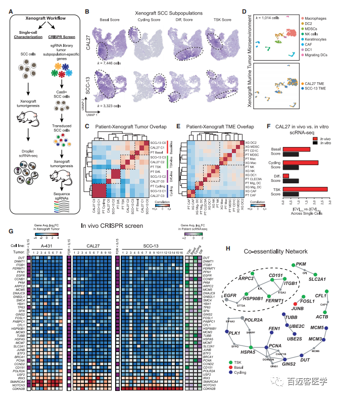 接下來,使用CRISPR/Cas9技術(shù)對3個鱗狀細胞癌移植瘤株進行篩選(4個亞群,334個富集基因),評估腫瘤KC亞群的功能作用(圖7A)。通過STARS算法,獲得38個命中點,其中18個至少被兩種細胞系共享(圖7F)。特別的,對腫瘤生長重要的基因偏向于在TSK、基底和循環(huán)細胞中表達。腫瘤循環(huán)KCs特有的參與細胞循環(huán)的基因形成了以PCNA和GINS2為中心的最大網(wǎng)絡(luò)。最大的TSK特異性網(wǎng)絡(luò)包括ITGB1、FERMT1、CD151、ARPC2、HSP90B1。ITGB1、CD151和 FERMT1的蛋白產(chǎn)物在細胞表面相互作用,介導(dǎo)整合素信號。通過體外實驗驗證ITGB1、FERMT1和CD151對腫瘤生長的重要性低于體內(nèi),證實了如果整合素信號介導(dǎo)與TME的通訊,相關(guān)基因在體內(nèi)腫瘤發(fā)生中應(yīng)該比在體外有更大的依賴性的推斷。綜上,體內(nèi)異種移植篩查結(jié)合TCGA分析突出了可能控制亞群特異性致瘤功能的關(guān)鍵基因。