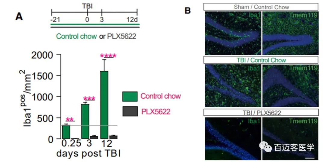 首先通過喂食小鼠集落刺激因子-1受體(CSF-1R)拮抗劑PLX5622 ,使小膠質(zhì)細(xì)胞衰竭,來檢查外傷性腦損傷(TBI)后小膠質(zhì)細(xì)胞缺失是否會改變海馬依賴任務(wù)中的認(rèn)知結(jié)果。用可控皮質(zhì)撞擊造成TBI,在腦外傷前3周開始持續(xù)給藥PLX5622,可導(dǎo)致大范圍的Iba1pos?、TMEM119pos細(xì)胞的丟失,包括海馬區(qū)。在腦外傷后的整個實驗時間內(nèi),海馬區(qū)保持95%的功能缺失。這些結(jié)果與喂食食物的小鼠對照組形成鮮明對比。在腦外傷后的12天內(nèi),海馬內(nèi)的Iba1pos細(xì)胞數(shù)量是假手術(shù)組的5倍。