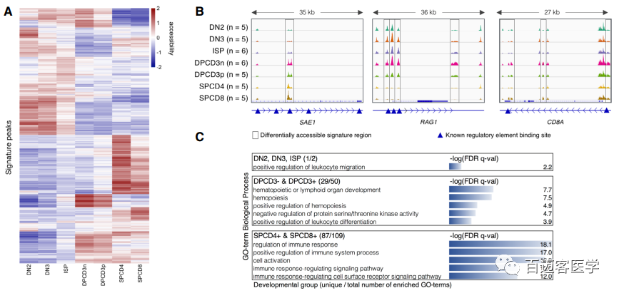 所有特征區(qū)域聚類熱圖將7個(gè)T細(xì)胞類群按其成熟的順序聚集在一起,突出了T細(xì)胞成熟過程中染色質(zhì)可及性的持續(xù)變化(圖2A)。連續(xù)發(fā)育階段的逐漸變化導(dǎo)致了DN3和ISP之間的輕度分離,雙陽性階段CD3和CD3+(圖2A)導(dǎo)致在使用CIBERSORT反褶積算法預(yù)測(cè)細(xì)胞類型預(yù)測(cè)精度不理想。利用主成分1和2的轉(zhuǎn)換,量化了特征OCRs的重要性并發(fā)現(xiàn)SUMO1激活酶亞基1上有一個(gè)峰(圖2B)。此外,OCRs差異可及性附近有階段性特征已知基因如CD8ARAG1/2(圖2B)。雙陽性組OCRs在與造血和白細(xì)胞分化相關(guān)的terms富集,單陽性組在免疫系統(tǒng)調(diào)節(jié)相關(guān)的terms富集(圖2C)。然而,雙陰性特征峰只富集在一個(gè)GO-term即白細(xì)胞遷移正調(diào)節(jié)(圖2C)。