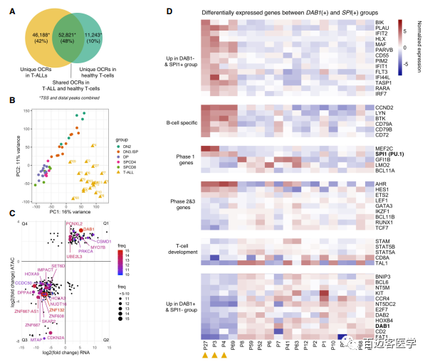 由于患者異質(zhì)性較高(圖5B),作者對(duì)每個(gè)患者進(jìn)行了DESeq2差異分析鑒定復(fù)發(fā)事件。與健康T細(xì)胞前體相比,作者在至少5個(gè)T-ALLs中鑒定出292個(gè)差異基因和差異可及性O(shè)CRs(圖5C)。102個(gè)峰/基因可及性強(qiáng)并過表達(dá),191個(gè)峰/基因可及性弱并低表達(dá)(圖5C)。4例未表達(dá)DAB1的患者(P3、P4、P27和P69)形成了一個(gè)不同的亞群其特征是SPI1過表達(dá),發(fā)育早期DN2貢獻(xiàn)率特別高(圖4C),3例患者TF SPI1(PU.1)結(jié)合位點(diǎn)可及性更高(圖4E)?;虮磉_(dá)和染色質(zhì)可及性差異分析顯示,表達(dá)SPI1的患者以基因過表達(dá)/超可及性為特征,并決定了T細(xì)胞發(fā)育的早期第一階段。這些基因包括MEF2C、MEIS1HOXA9 ,基因特征為B細(xì)胞前體如LYNBTK、cyclin D2、CD79A、CD79BCD72(圖5D)。DAB1過表達(dá)和超可及性T-ALLs趨向于T細(xì)胞發(fā)育后期2和3階段過表達(dá)基因如TCF7、LEF1RUNX1(圖5D)。綜上所述,這些數(shù)據(jù)涉及到DAB1和SPI1一個(gè)未知的相互排斥的生物學(xué)意義,并將T細(xì)胞發(fā)育階段,即兒童T- ALLs可能起源于成熟T細(xì)胞發(fā)育途徑的不同層次,盡管早期水平始終一致。