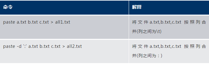 Paste命令可按列合并命令,可以很輕松的將兩個(gè)文件按列合并,下面是常見(jiàn)的舉例:?